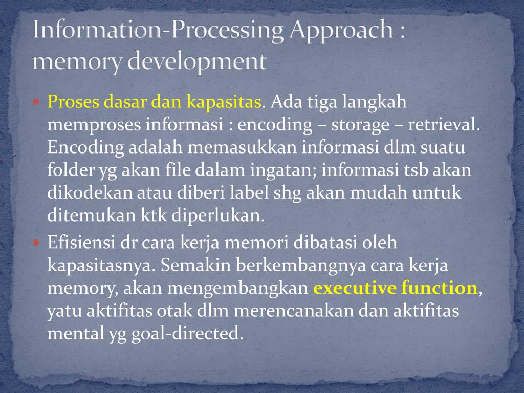 Information-Processing Approach : memory development • Proses dasar dan kapasitas. Ada tiga langkah memproses informasi : encoding – storage – retrieval. Encoding adalah memasukkan informasi dlm suatu folder yg akan file dalam ingatan; informasi tsb akan dikodekan atau diberi label shg akan mudah untuk ditemukan ktk diperlukan. • Efisiensi dr cara kerja memori dibatasi oleh kapasitasnya. Semakin berkembangnya cara kerja memory, akan mengembangkan executive function, yatu aktifitas otak dlm merencanakan dan aktifitas mental yg goal-directed.