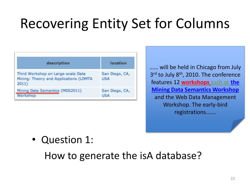Recovering Entity Set for Columns • Question 1: How to generate the isA database? …… will be held in Chicago from July 3rd to July 8th, 2010. The conference features 12 workshopssuch as the Mining Data Semantics Workshopand the Web Data Management Workshop. The early-bird registrations…….