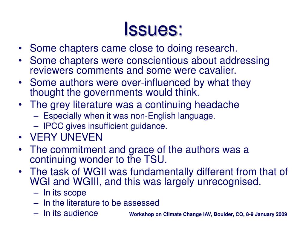 Issues: • Some chapters came close to doing research. • Some chapters were conscientious about addressing reviewers comments and some were cavalier. • Some authors were over-influenced by what they thought the governments would think. • The grey literature was a continuing headache • Especially when it was non-English language. • IPCC gives insufficient guidance. • VERY UNEVEN • The commitment and grace of the authors was a continuing wonder to the TSU. • The task of WGII was fundamentally different from that of WGI and WGIII, and this was largely unrecognised. • In its scope • In the literature to be assessed • In its audience Workshop on Climate Change IAV, Boulder, CO, 8-9 January 2009