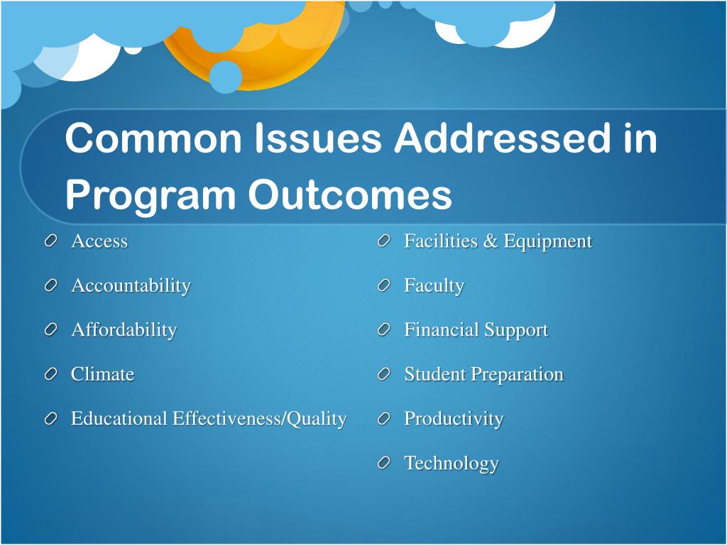 Common Issues Addressed in Program Outcomes • Facilities & Equipment • Faculty • Financial Support • Student Preparation • Productivity • Technology • Access • Accountability • Affordability • Climate • Educational Effectiveness/Quality