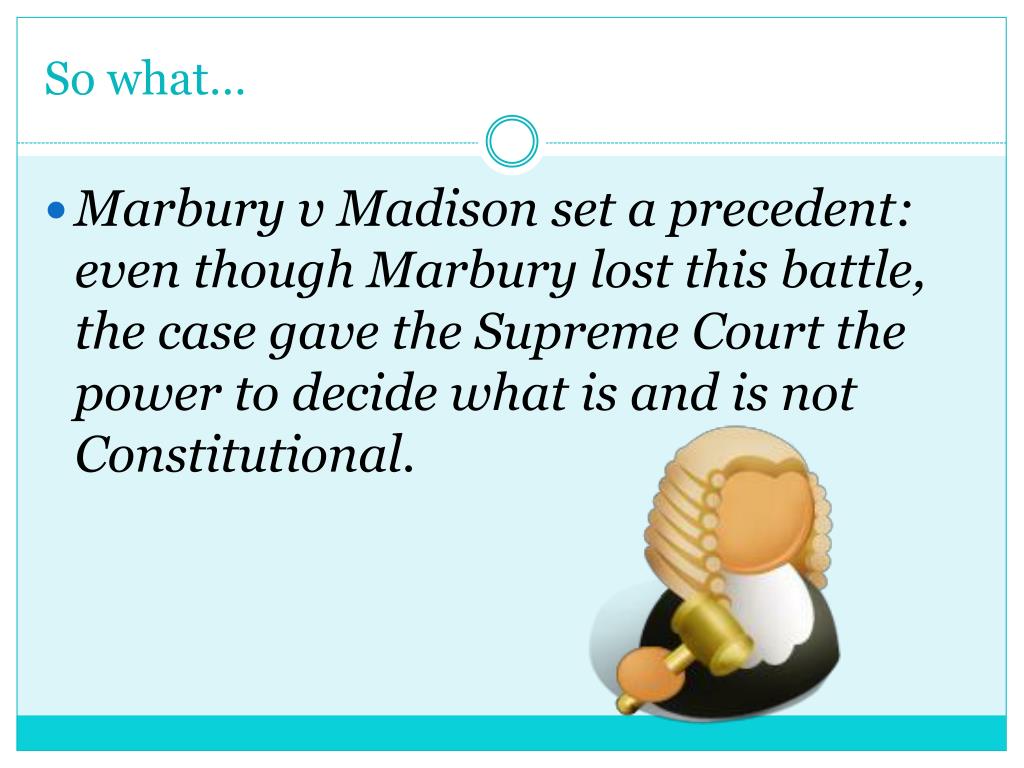 So what… Marbury v Madison set a precedent: even though Marbury lost this battle, the case gave the Supreme Court the power to decide what is and is not Constitutional.