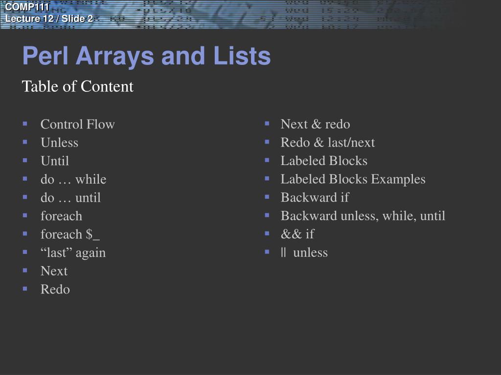 More Perl Control Flow. Learning Objectives: To learn more commands for control flow To apply the new commands learnt for writing tidier program To understand the limitation of using some control flow statements. Perl Arrays and Lists. Table of Content Control Flow Unless Until