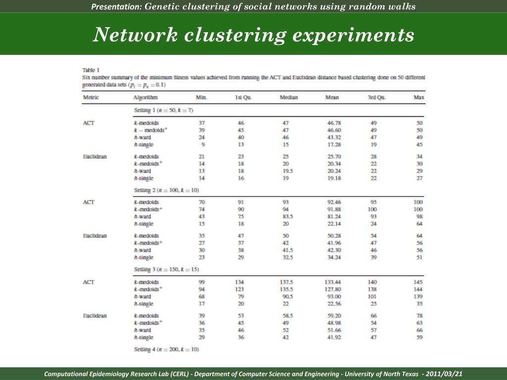 Contents Presentation: Genetic clustering of social networks using random walks • Introduction to Clustering in networks • Random walk based distance measure • Genetic representation • Experiments • Synthetic data creation • Network clustering experiments • Spatial data experiments • Conclusion Computational Epidemiology Research Lab (CERL) - Department of Computer Science and Engineering - University of North Texas - 2011/03/21