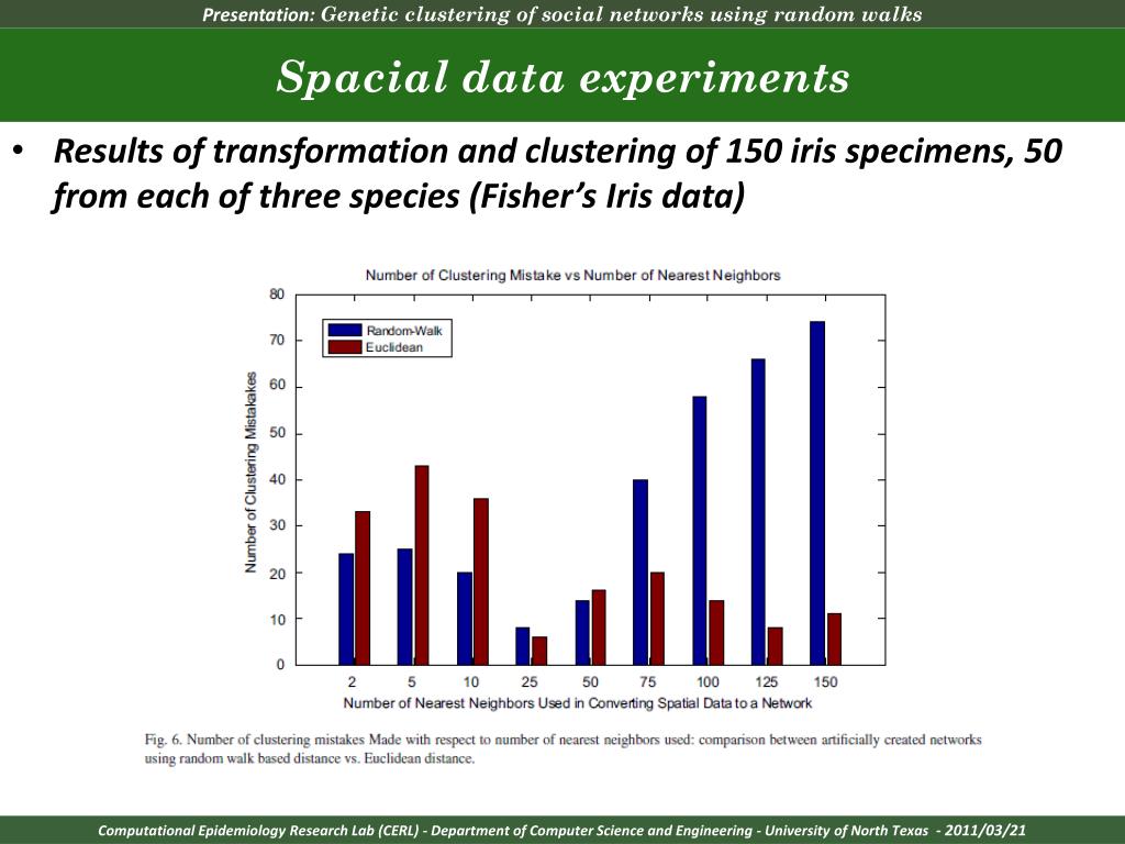 Spacial data experiments Presentation: Genetic clustering of social networks using random walks • Results of transformation and clustering of 150 iris specimens, 50 from each of three species (Fisher’s Iris data) Computational Epidemiology Research Lab (CERL) - Department of Computer Science and Engineering - University of North Texas - 2011/03/21