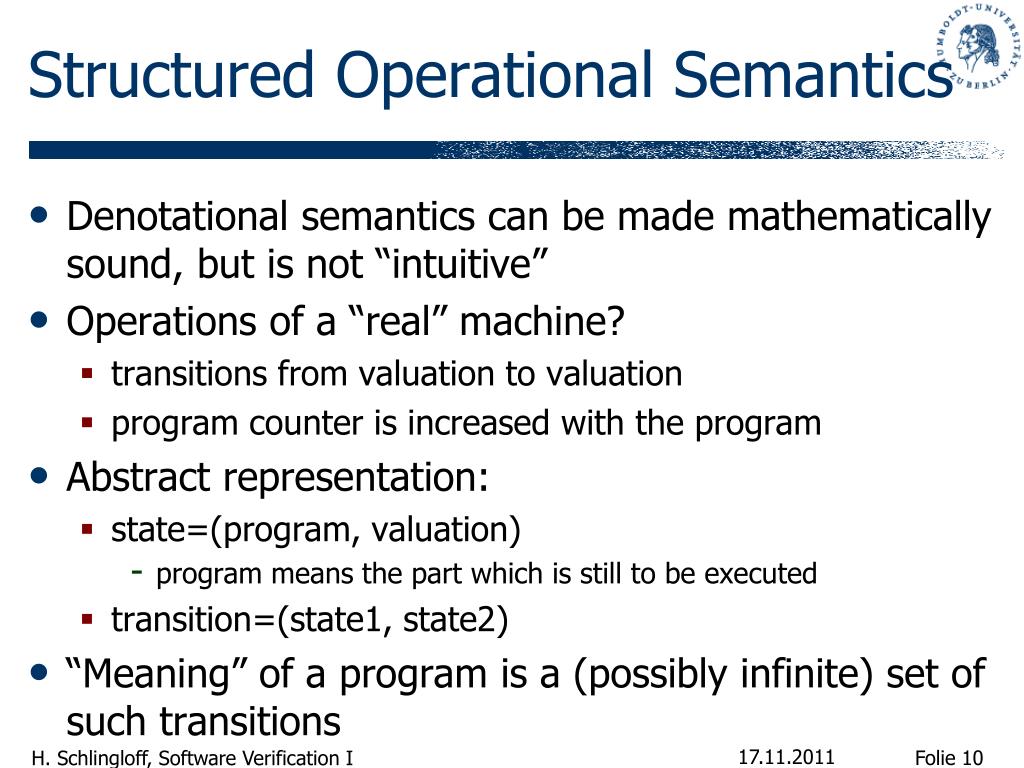 Structured Operational Semantics • Denotational semantics can be made mathematically sound, but is not “intuitive” • Operations of a “real” machine? • transitions from valuation to valuation • program counter is increased with the program • Abstract representation: • state=(program, valuation) • program means the part which is still to be executed • transition=(state1, state2) • “Meaning” of a program is a (possibly infinite) set of such transitions