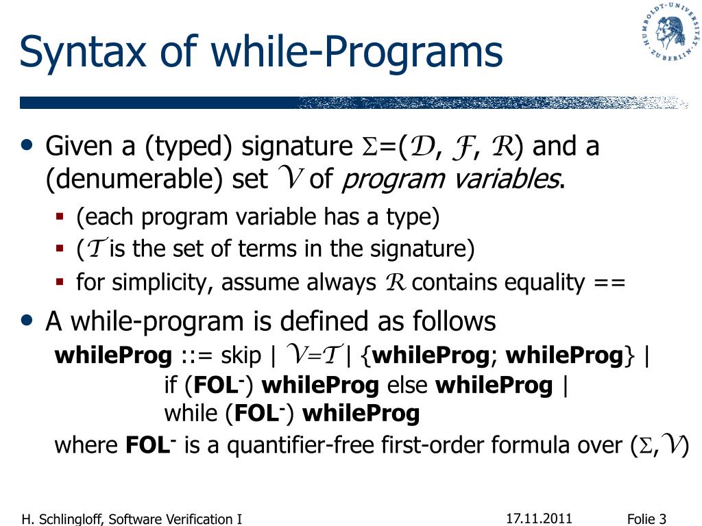 Syntax of while-Programs • Given a (typed) signature =(D, F, R) and a (denumerable) set V of program variables. • (each program variable has a type) • (T is the set of terms in the signature) • for simplicity, assume always R contains equality == • A while-program is defined as follows whileProg ::= skip | V=T| {whileProg; whileProg} | if (FOL-) whileProg else whileProg | while (FOL-) whileProg whereFOL- is a quantifier-free first-order formula over (,V)