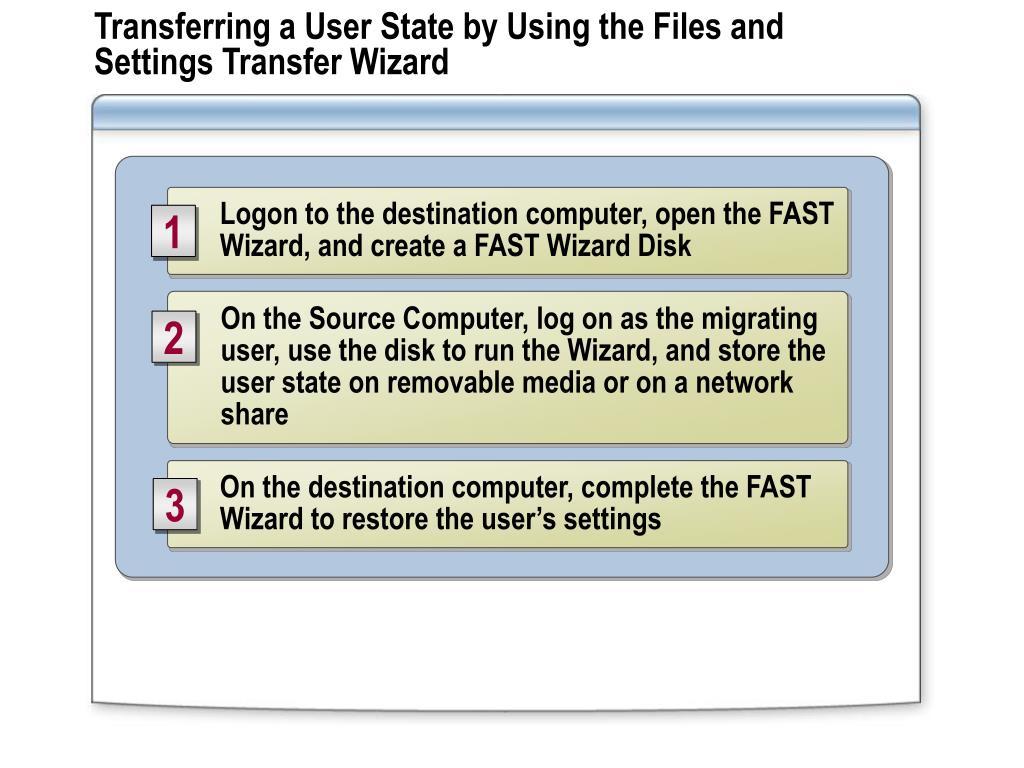 Transferring a User State by Using the Files and Settings Transfer Wizard Logon to the destination computer, open the FAST Wizard, and create a FAST Wizard Disk 1 On the Source Computer, log on as the migrating user, use the disk to run the Wizard, and store the user state on removable media or on a network share 2 On the destination computer, complete the FAST Wizard to restore the user’s settings 3