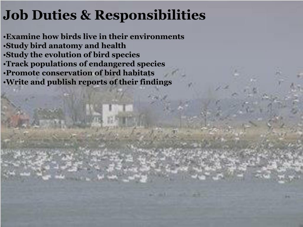 Job Duties & Responsibilities • Examine how birds live in their environments • Study bird anatomy and health • Study the evolution of bird species • Track populations of endangered species • Promote conservation of bird habitats • Write and publish reports of their findings