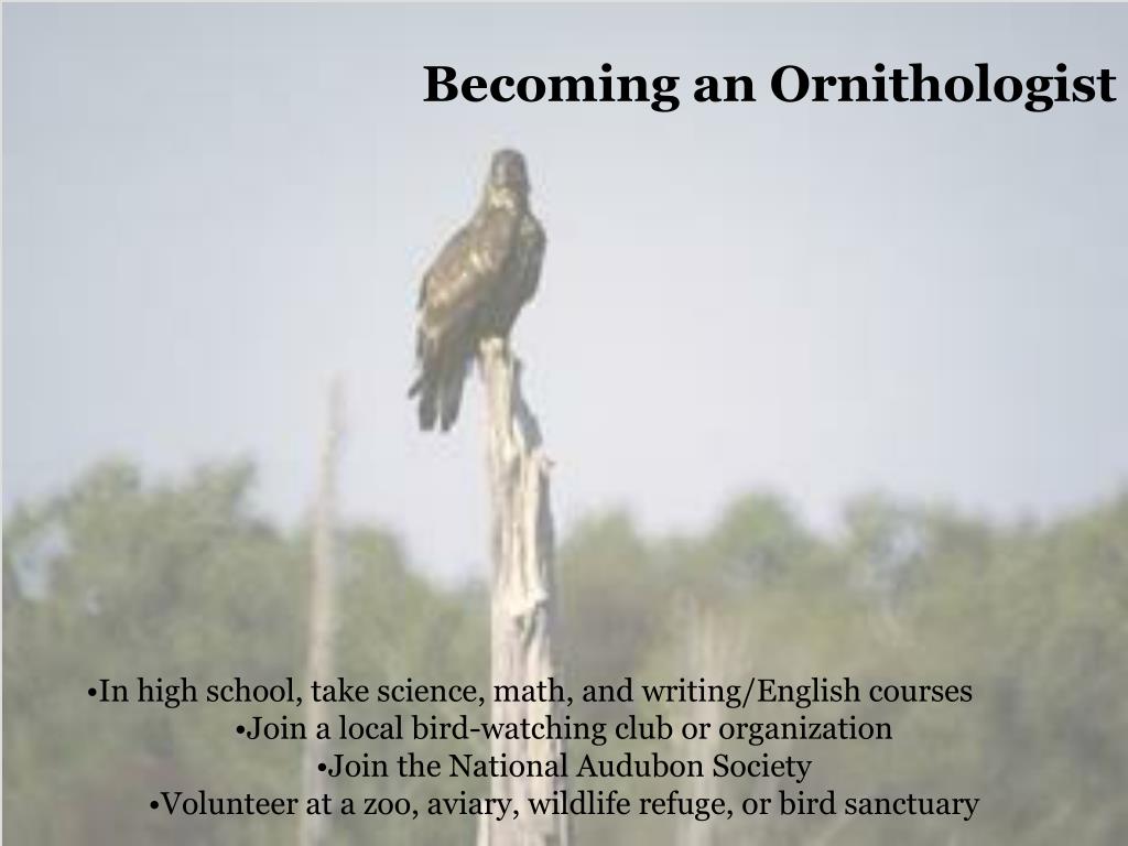 Becoming an Ornithologist • In high school, take science, math, and writing/English courses • Join a local bird-watching club or organization • Join the National Audubon Society • Volunteer at a zoo, aviary, wildlife refuge, or bird sanctuary