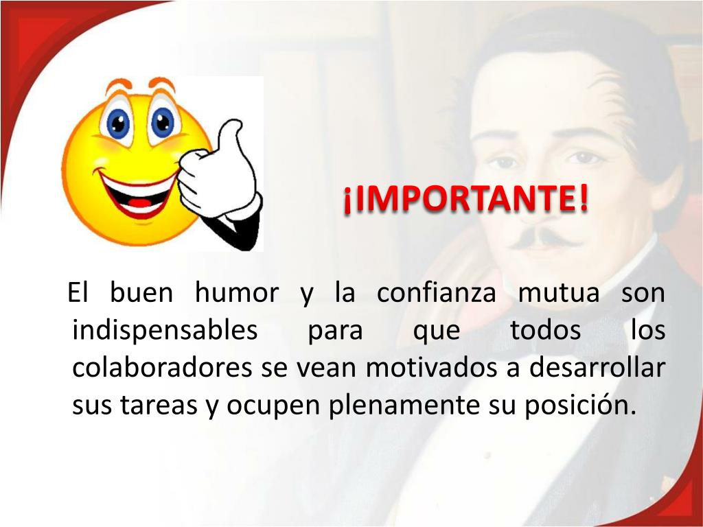 El buen humor y la confianza mutua son indispensables para que todos los colaboradores se vean motivados a desarrollar sus tareas y ocupen plenamente su posición. ¡IMPORTANTE!