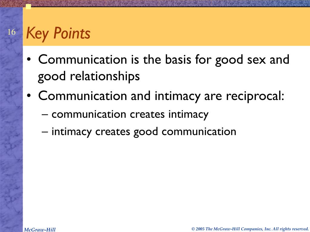 Key Points • Communication is the basis for good sex and good relationships • Communication and intimacy are reciprocal: • communication creates intimacy • intimacy creates good communication