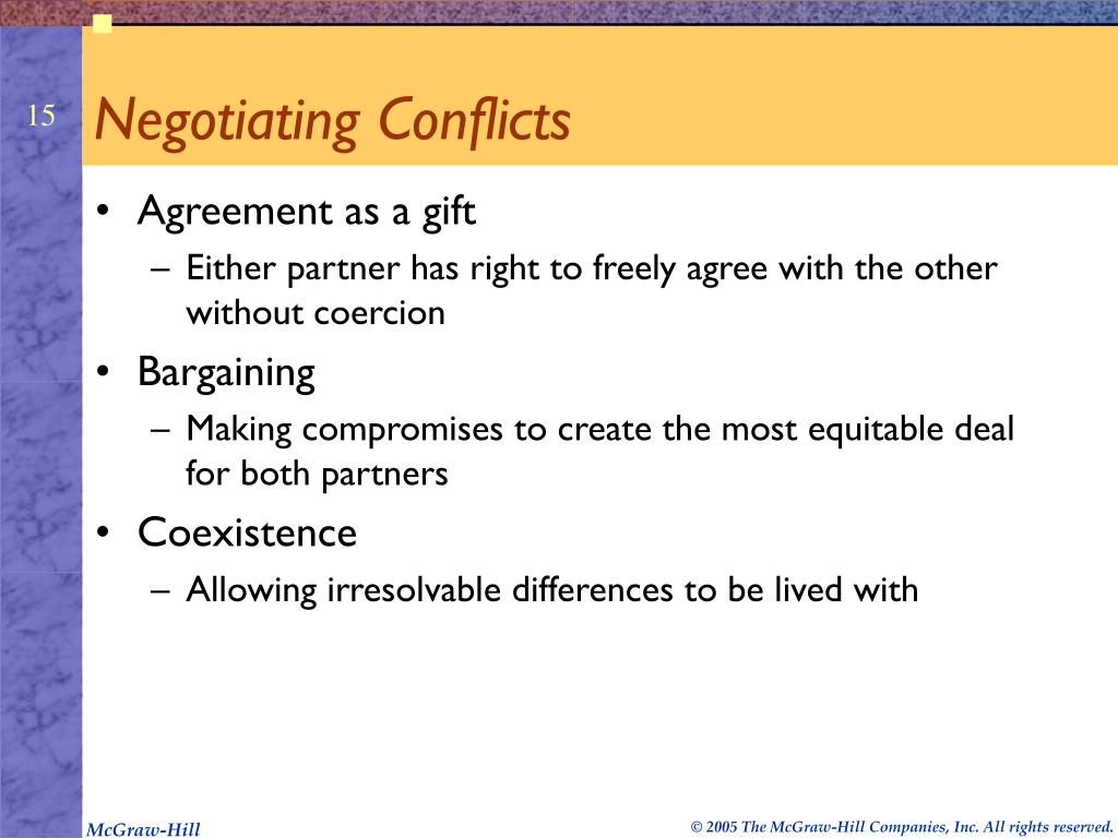 Negotiating Conflicts • Agreement as a gift • Either partner has right to freely agree with the other without coercion • Bargaining • Making compromises to create the most equitable deal for both partners • Coexistence • Allowing irresolvable differences to be lived with