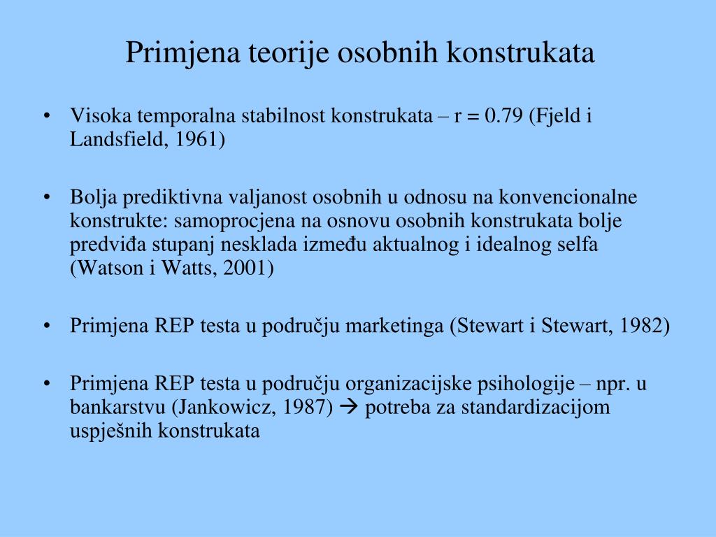 Primjena teorije osobnih konstrukata Visoka temporalna stabilnost konstrukata – r = 0.79 (Fjeld i Landsfield, 1961) Bolja prediktivna valjanost osobnih u odnosu na konvencionalne konstrukte: samoprocjena na osnovu osobnih konstrukata bolje predviđa stupanj nesklada između aktualnog i idealnog selfa (Watson i Watts, 2001) Primjena REP testa u području marketinga (Stewart i Stewart, 1982) Primjena REP testa u području organizacijske psihologije – npr. u bankarstvu (Jankowicz, 1987) potreba za standardizacijom uspješnih konstrukata