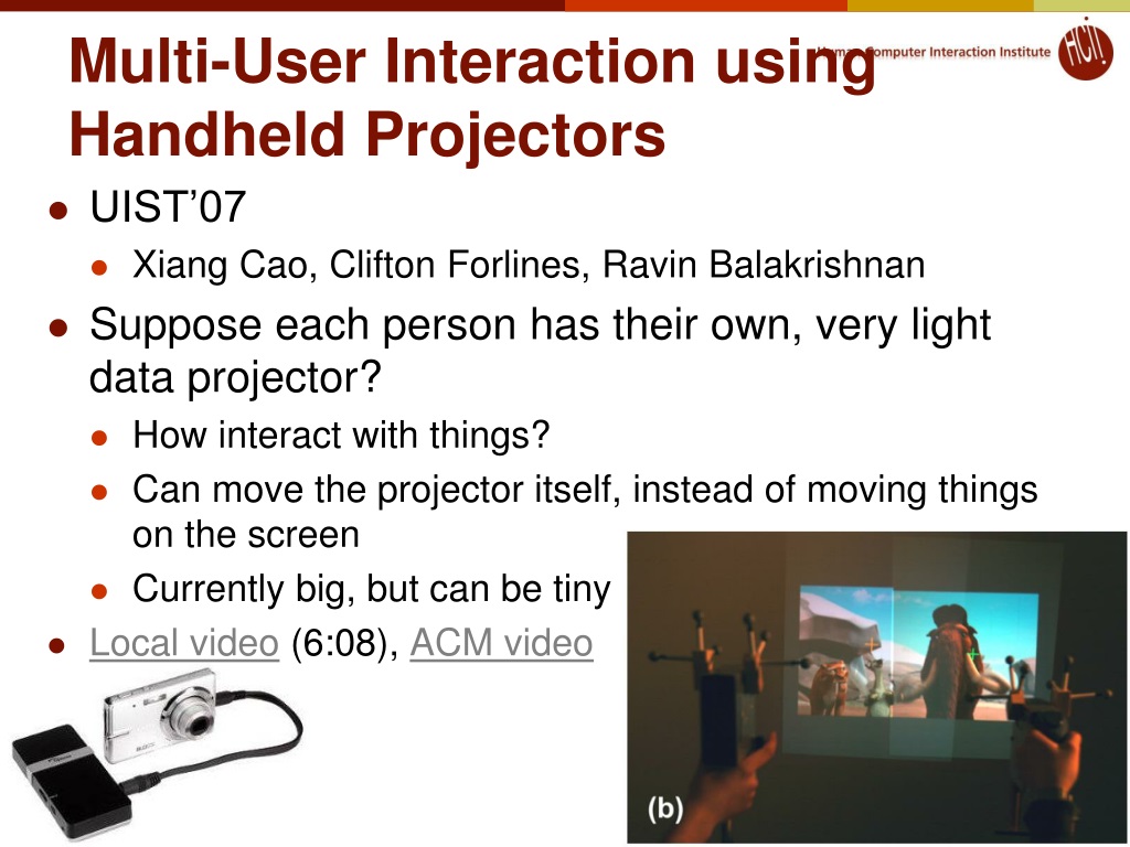 Multi-User Interaction using Handheld Projectors • UIST’07 • Xiang Cao, Clifton Forlines, RavinBalakrishnan • Suppose each person has their own, very light data projector? • How interact with things? • Can move the projector itself, instead of moving things on the screen • Currently big, but can be tiny • Local video (6:08), ACM video