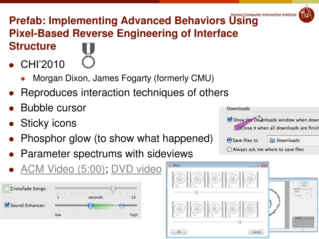 Prefab: Implementing Advanced Behaviors UsingPixel-Based Reverse Engineering of Interface Structure • CHI’2010 • Morgan Dixon, James Fogarty(formerly CMU) • Reproduces interaction techniques of others • Bubble cursor • Sticky icons • Phosphor glow (to show what happened) • Parameter spectrums with sideviews • ACM Video (5:00); DVD video