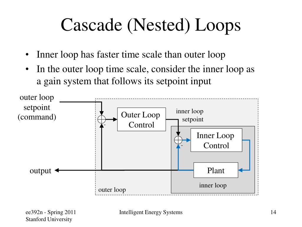 Cascade (Nested) Loops • Inner loop has faster time scale than outer loop • In the outer loop time scale, consider the inner loop as a gain system that follows its setpoint input outer loop setpoint outer loop inner loop setpoint Outer Loop Control (command) - inner loop Inner Loop Control - Plant output Intelligent Energy Systems