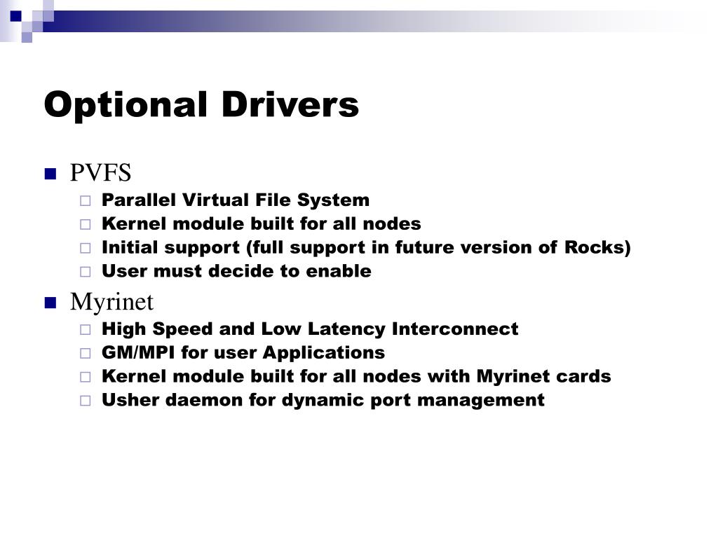 Optional Drivers • PVFS • Parallel Virtual File System • Kernel module built for all nodes • Initial support (full support in future version of Rocks) • User must decide to enable • Myrinet • High Speed and Low Latency Interconnect • GM/MPI for user Applications • Kernel module built for all nodes with Myrinet cards • Usher daemon for dynamic port management