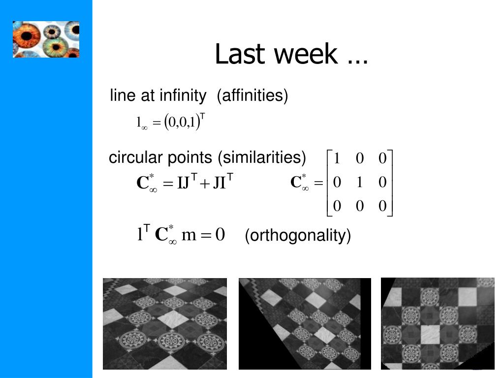 Last week … line at infinity (affinities) circular points (similarities) (orthogonality)