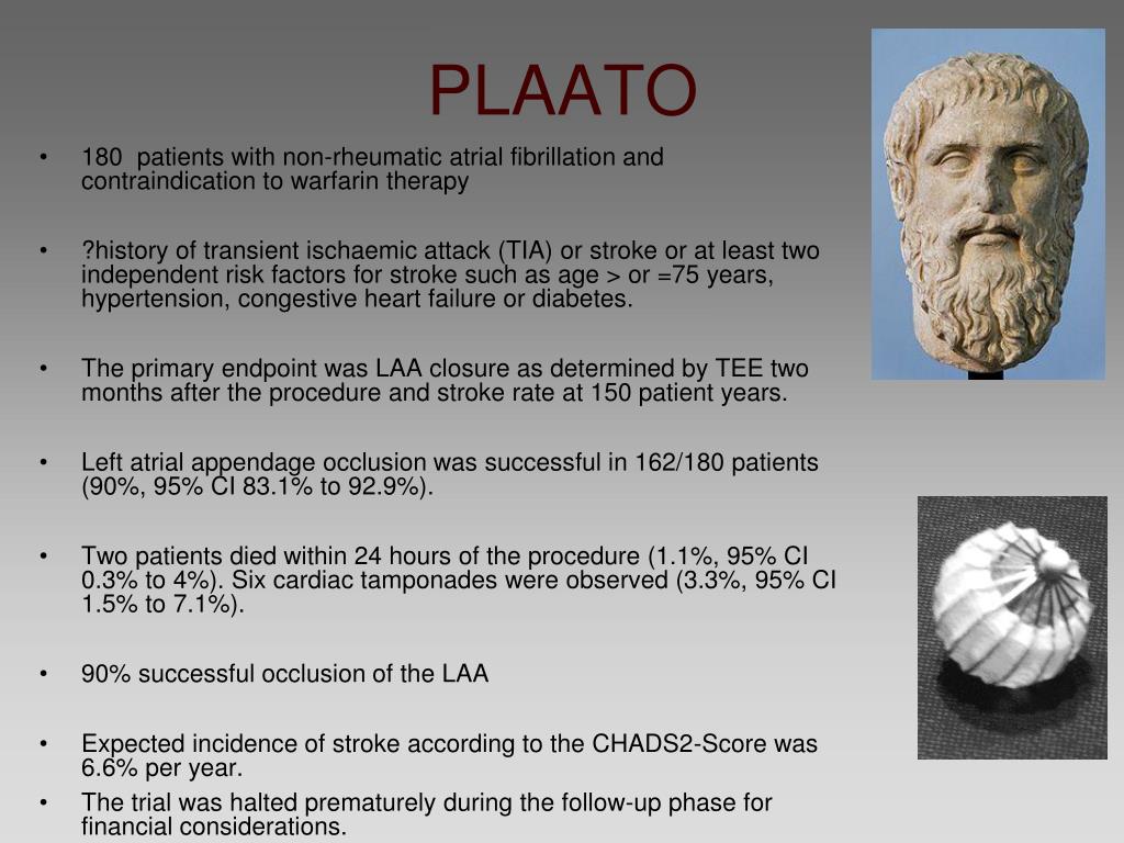 PLAATO • 180 patients with non-rheumatic atrial fibrillation and contraindication to warfarin therapy • ?history of transient ischaemic attack (TIA) or stroke or at least two independent risk factors for stroke such as age > or =75 years, hypertension, congestive heart failure or diabetes. • The primary endpoint was LAA closure as determined by TEE two months after the procedure and stroke rate at 150 patient years. • Left atrial appendage occlusion was successful in 162/180 patients (90%, 95% CI 83.1% to 92.9%). • Two patients died within 24 hours of the procedure (1.1%, 95% CI 0.3% to 4%). Six cardiac tamponades were observed (3.3%, 95% CI 1.5% to 7.1%). • 90% successful occlusion of the LAA • Expected incidence of stroke according to the CHADS2-Score was 6.6% per year. • The trial was halted prematurely during the follow-up phase for financial considerations.