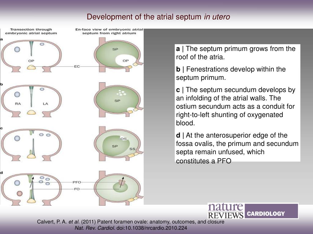 a| The septum primum grows from the roof of the atria. b| Fenestrations develop within the septum primum. c| The septum secundum develops by an infolding of the atrial walls. The ostium secundum acts as a conduit for right-to-left shunting of oxygenated blood. d| At the anterosuperior edge of the fossa ovalis, the primum and secundum septa remain unfused, which constitutes a PFO Development of the atrial septum in utero Calvert, P. A. et al. (2011) Patent foramen ovale: anatomy, outcomes, and closure Nat. Rev. Cardiol. doi:10.1038/nrcardio.2010.224