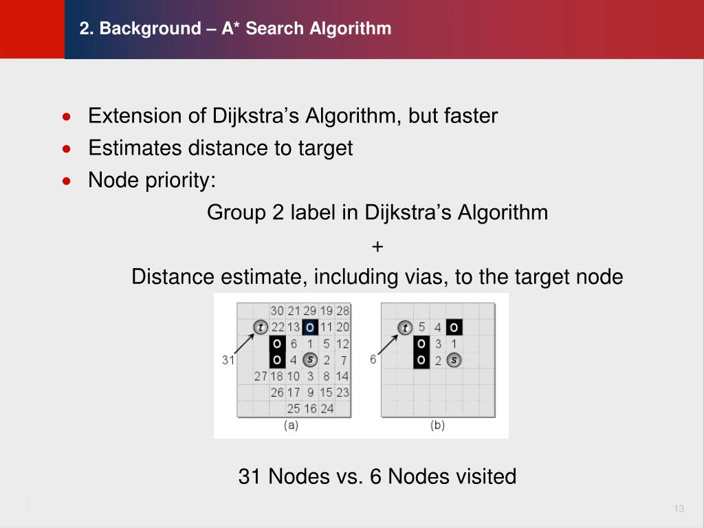 2. Background – A* Search Algorithm • Extension of Dijkstra’s Algorithm, but faster • Estimates distance to target • Node priority: Group 2 label in Dijkstra’s Algorithm + Distance estimate, including vias, to the target node 31 Nodes vs. 6 Nodes visited