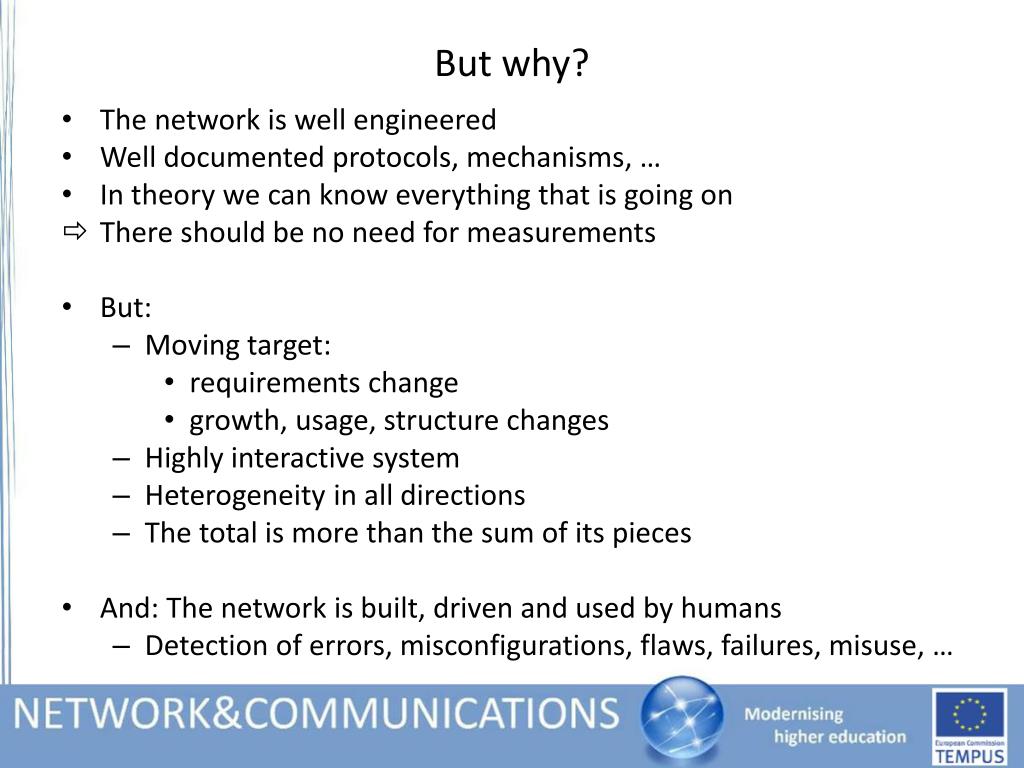 But why? • The network is well engineered • Well documented protocols, mechanisms, … • In theory we can know everything that is going on • There should be no need for measurements • But: • Moving target: • requirements change • growth, usage, structure changes • Highly interactive system • Heterogeneity in all directions • The total is more than the sum of its pieces • And: The network is built, driven and used by humans • Detection of errors, misconfigurations, flaws, failures, misuse, …