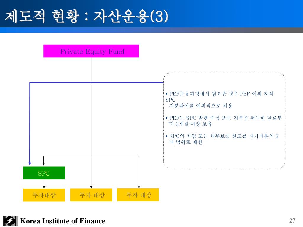 제도적 현황 : 자산운용(3) Private Equity Fund • PEF운용과정에서 필요한 경우 PEF 이외 자의 SPC 지분참여를 예외적으로 허용 • PEF는 SPC 발행 주식 또는 지분을 취득한 날로부 터 6개월 이상 보유 • SPC의 차입 또는 채무보증 한도를 자기자본의 2 배 범위로 제한 SPC 투자 대상 투자 대상 투자대상 Korea Institute of Finance