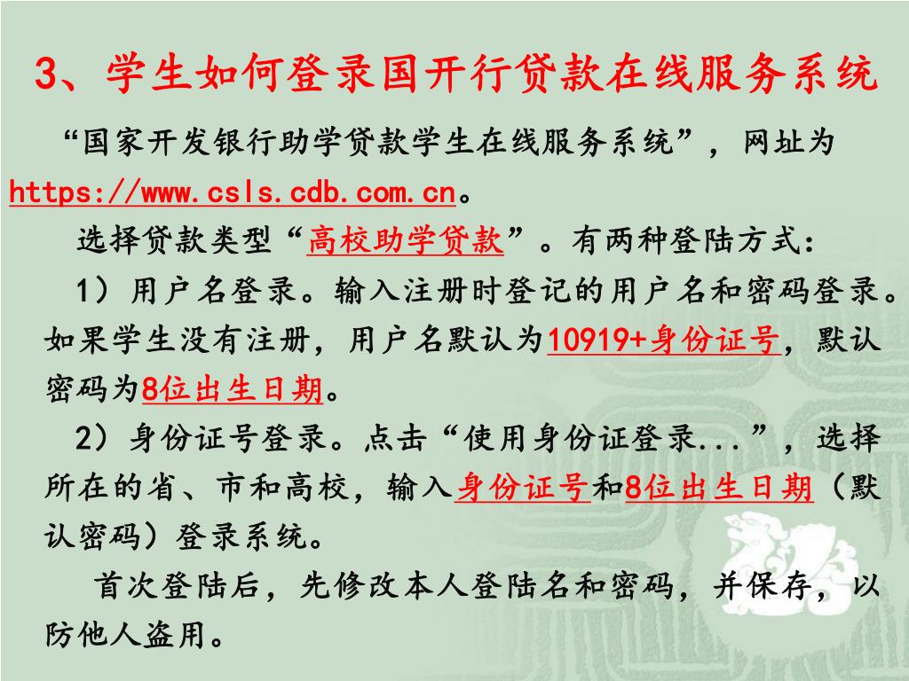3、学生如何登录国开行贷款在线服务系统 “国家开发银行助学贷款学生在线服务系统”,网址为 https://www.csls.cdb.com.cn。 选择贷款类型“高校助学贷款”。有两种登陆方式: 1)用户名登录。输入注册时登记的用户名和密码登录。如果学生没有注册,用户名默认为10919+身份证号,默认密码为8位出生日期。 2)身份证号登录。点击“使用身份证登录...”,选择所在的省、市和高校,输入身份证号和8位出生日期(默认密码)登录系统。 首次登陆后,先修改本人登陆名和密码,并保存,以防他人盗用。