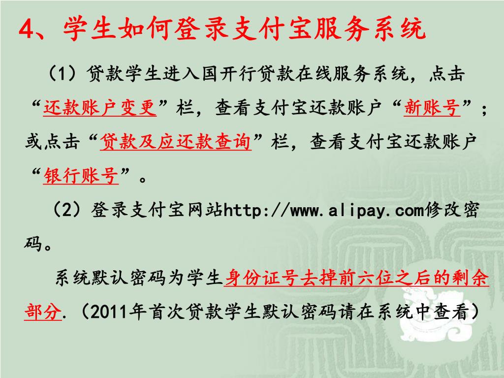 4、学生如何登录支付宝服务系统 (1)贷款学生进入国开行贷款在线服务系统,点击“还款账户变更”栏,查看支付宝还款账户“新账号”;或点击“贷款及应还款查询”栏,查看支付宝还款账户“银行账号”。 (2)登录支付宝网站http://www.alipay.com修改密码。 系统默认密码为学生身份证号去掉前六位之后的剩余部分.(2011年首次贷款学生默认密码请在系统中查看)