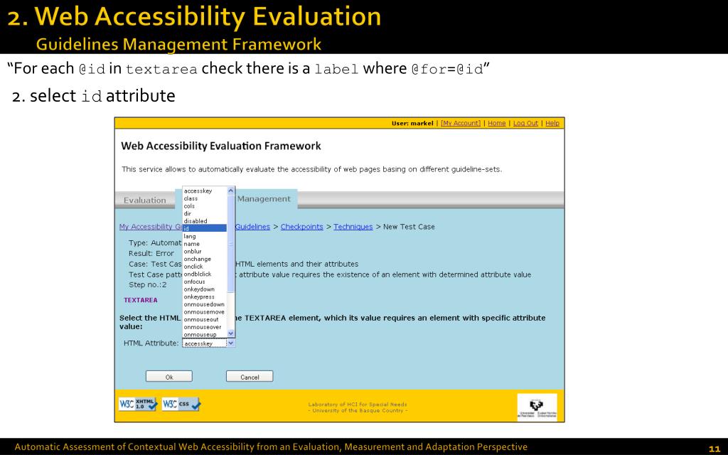 2. Web Accessibility EvaluationGuidelines Management Framework 3. select label element “For each @id in textarea check there is a label where @for=@id” • Automatic Assessment of Contextual Web Accessibility from an Evaluation, Measurement and Adaptation Perspective