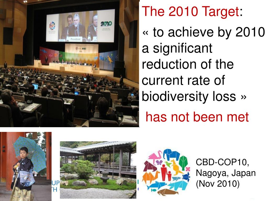 The 2010 Target: « to achieve by 2010 a significant reduction of the current rate of biodiversity loss » has not been met CBD-COP10, Nagoya, Japan (Nov 2010)