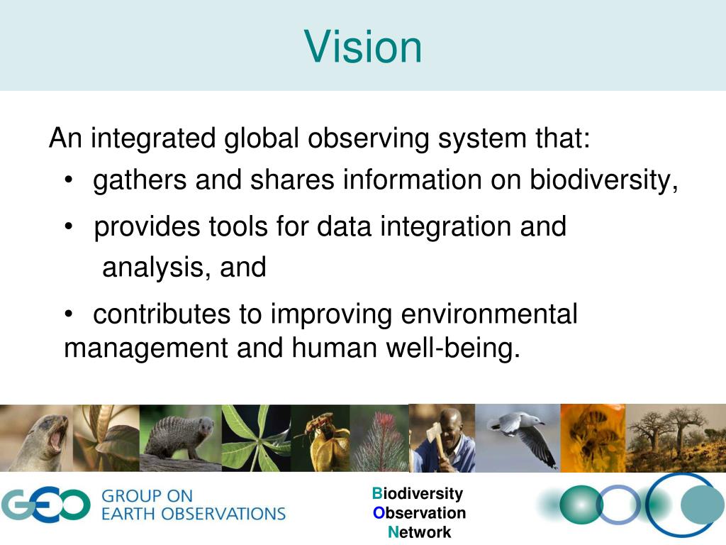 Biodiversity Observation Network Vision An integrated global observing system that: • gathers and shares information on biodiversity, • provides tools for data integration and analysis, and • contributes to improving environmental management and human well-being.