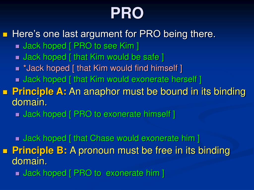 PRO • Here’s one last argument for PRO being there. • Jack hoped [ PRO to see Kim ] • Jack hoped [ that Kim would be safe ] • *Jack hoped [ that Kim would find himself ] • Jack hoped [ that Kim would exonerate herself ] • Principle A:An anaphor must be bound in its binding domain. • Jack hoped [ PRO to exonerate himself ] • Jack hoped [ that Chase would exonerate him ] • Principle B: A pronoun must be free in its binding domain. • Jack hoped [ PRO to exonerate him ]
