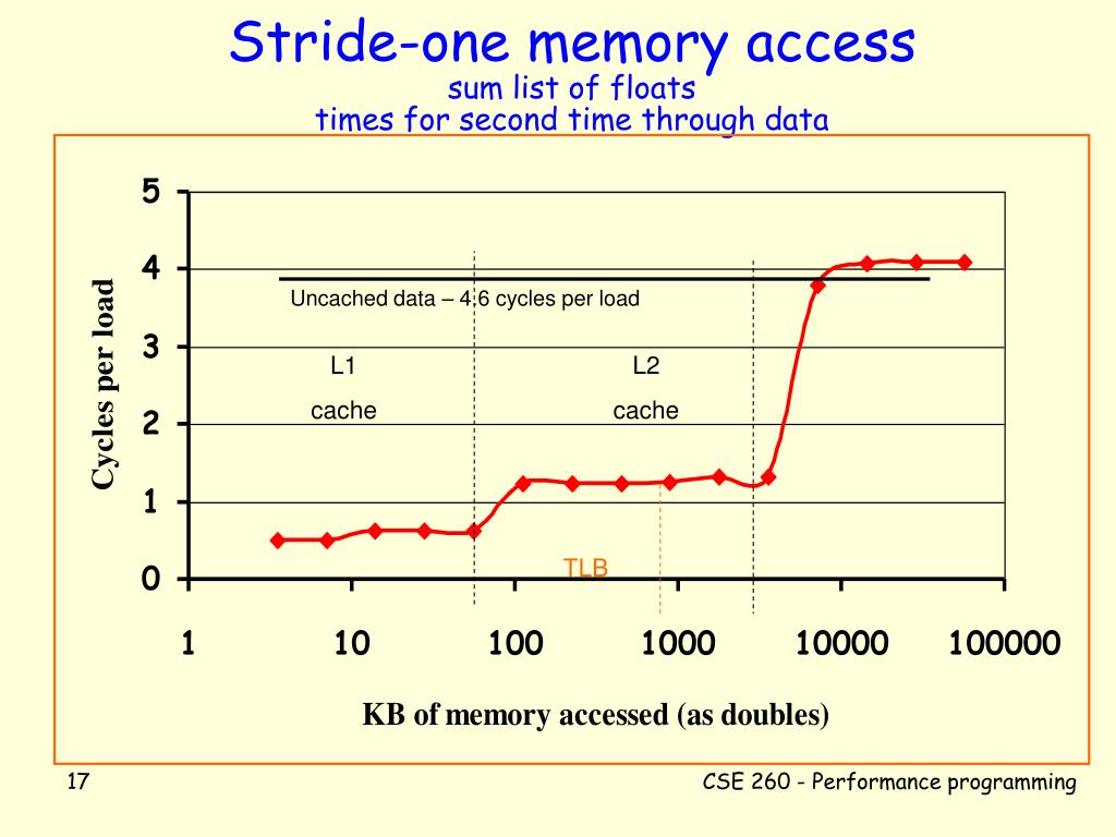 Stride-one memory accesssum list of floatstimes for second time through data Uncached data – 4.6 cycles per load L1 cache L2 cache TLB CSE 260 - Performance programming