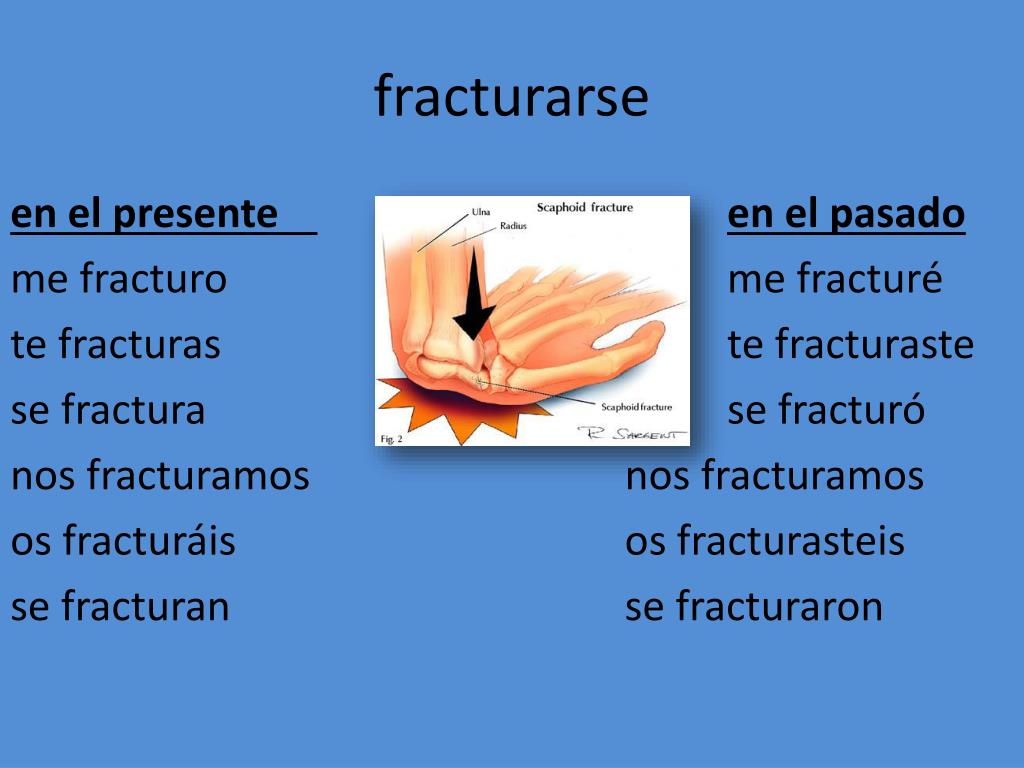 fracturarse en el presenteen el pasado me fracturo me fracturé tefracturastefracturaste se fractura se fracturó nosfracturamosnosfracturamos osfracturáisosfracturasteis se fracturan se fracturaron