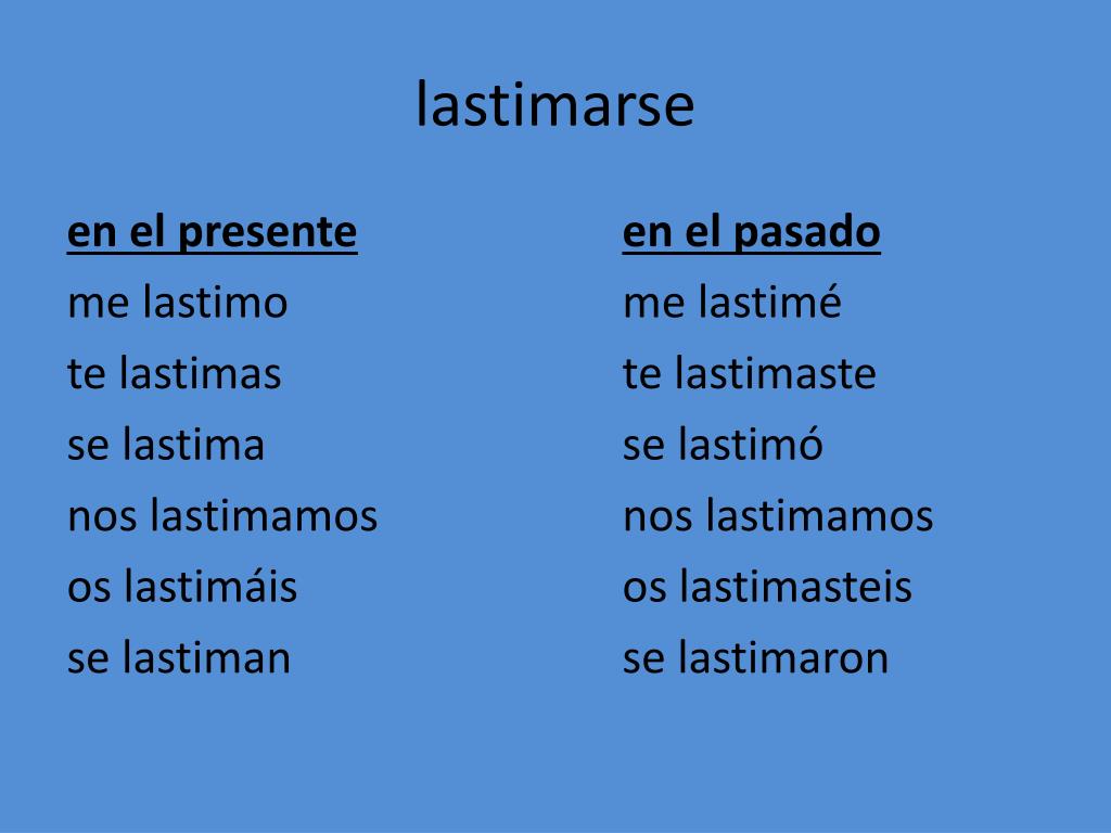lastimarse en el presenteen el pasado me lastimo me lastimé telastimastelastimaste se lastima se lastimó noslastimamosnoslastimamos oslastimáisoslastimasteis se lastiman se lastimaron