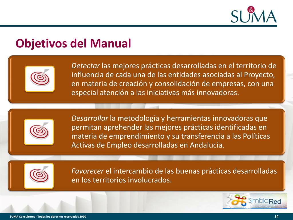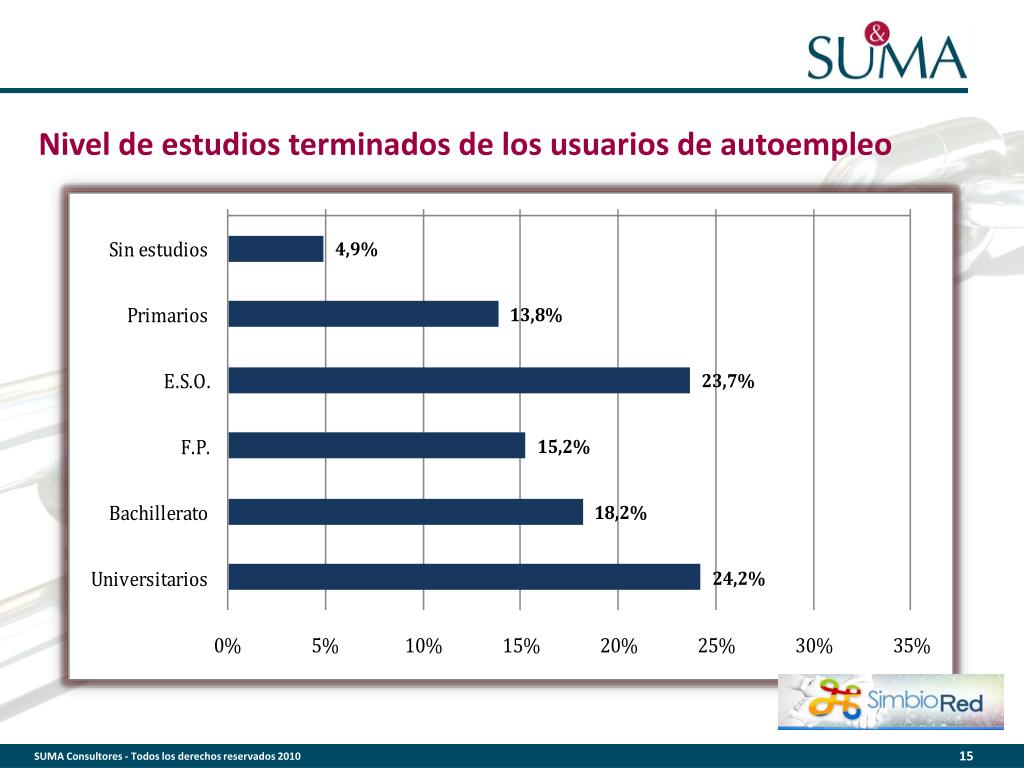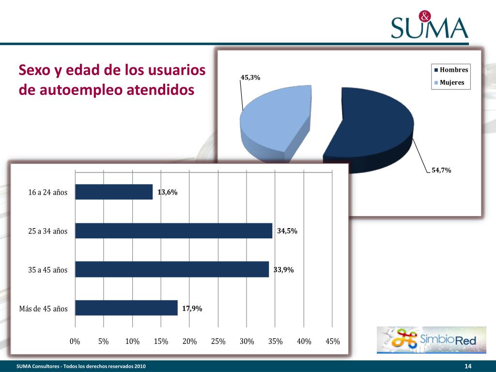 Fortalezas en autoempleo (territorio Simbiored) • Amplia experiencia acumulada por las entidades. • Elevada calidad de los recursos empleados. • Servicio integral a emprendedores. • Puntos de Asesoramiento e Inicio de Tramitación (PAIT). • Elevado número de usuarios atendidos. • Volumen de usuarios que culminan el proceso creando una empresa. • Índice de pervivencia al primer año de actividad en magnitudes similares a la media nacional. • Volumen de inversión global movilizada.