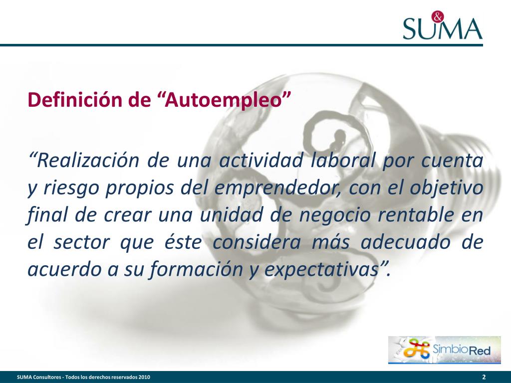 Definición de “Autoempleo” “Realización de una actividad laboral por cuenta y riesgo propios del emprendedor, con el objetivo final de crear una unidad de negocio rentable en el sector que éste considera más adecuado de acuerdo a su formación y expectativas”.