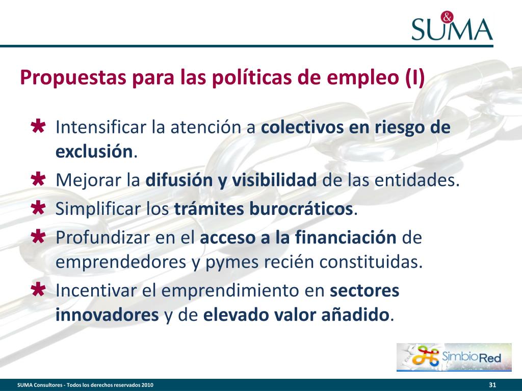 Propuestas para las políticas de empleo (I) • Intensificar la atención a colectivos en riesgo de exclusión. • Mejorar la difusión y visibilidad de las entidades. • Simplificar los trámites burocráticos. • Profundizar en el acceso a la financiación de emprendedores y pymes recién constituidas. • Incentivar el emprendimiento en sectores innovadores y de elevado valor añadido.