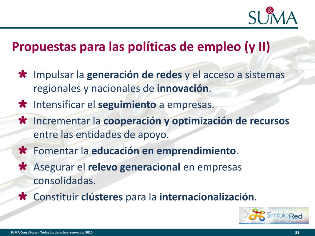 Propuestas para las políticas de empleo (y II) • Impulsar la generación de redes y el acceso a sistemas regionales y nacionales de innovación. • Intensificar el seguimiento a empresas. • Incrementar la cooperación y optimización de recursos entre las entidades de apoyo. • Fomentar la educación en emprendimiento. • Asegurar el relevo generacional en empresas consolidadas. • Constituir clústeres para la internacionalización.