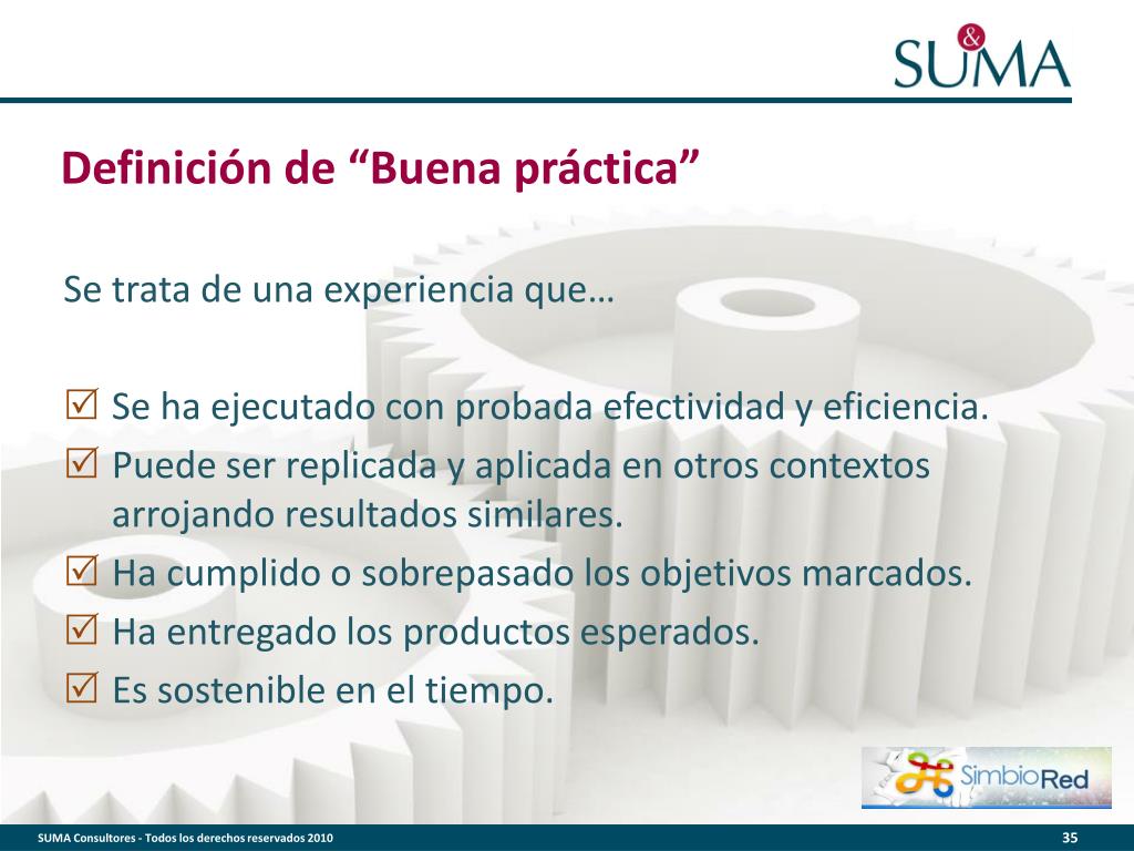 Definición de “Buena práctica” • Se trata de una experiencia que… • Se ha ejecutado con probada efectividad y eficiencia. • Puede ser replicada y aplicada en otros contextos arrojando resultados similares. • Ha cumplido o sobrepasado los objetivos marcados. • Ha entregado los productos esperados. • Es sostenible en el tiempo.
