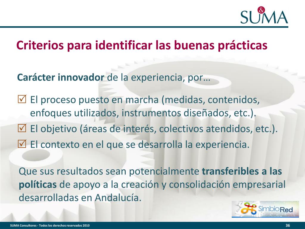 Criterios para identificar las buenas prácticas • Carácter innovador de la experiencia, por… • El proceso puesto en marcha (medidas, contenidos, enfoques utilizados, instrumentos diseñados, etc.). • El objetivo (áreas de interés, colectivos atendidos, etc.). • El contexto en el que se desarrolla la experiencia. Que sus resultados sean potencialmente transferibles a las políticas de apoyo a la creación y consolidación empresarial desarrolladas en Andalucía.