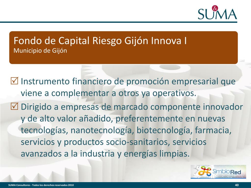 Fondo de Capital Riesgo Gijón Innova I • Municipio de Gijón • Instrumento financiero de promoción empresarial que viene a complementar a otros ya operativos. • Dirigido a empresas de marcado componente innovador y de alto valor añadido, preferentemente en nuevas tecnologías, nanotecnología, biotecnología, farmacia, servicios y productos socio-sanitarios, servicios avanzados a la industria y energías limpias.