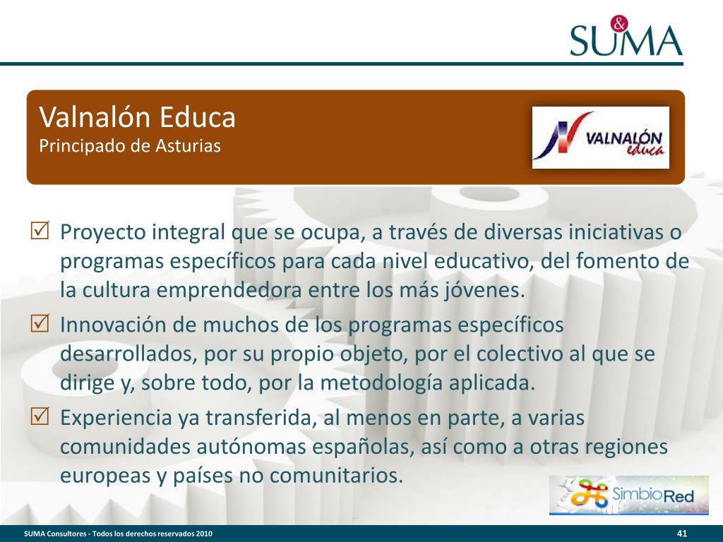 Valnalón Educa • Principado de Asturias • Proyecto integral que se ocupa, a través de diversas iniciativas o programas específicos para cada nivel educativo, del fomento de la cultura emprendedora entre los más jóvenes. • Innovación de muchos de los programas específicos desarrollados, por su propio objeto, por el colectivo al que se dirige y, sobre todo, por la metodología aplicada. • Experiencia ya transferida, al menos en parte, a varias comunidades autónomas españolas, así como a otras regiones europeas y países no comunitarios.