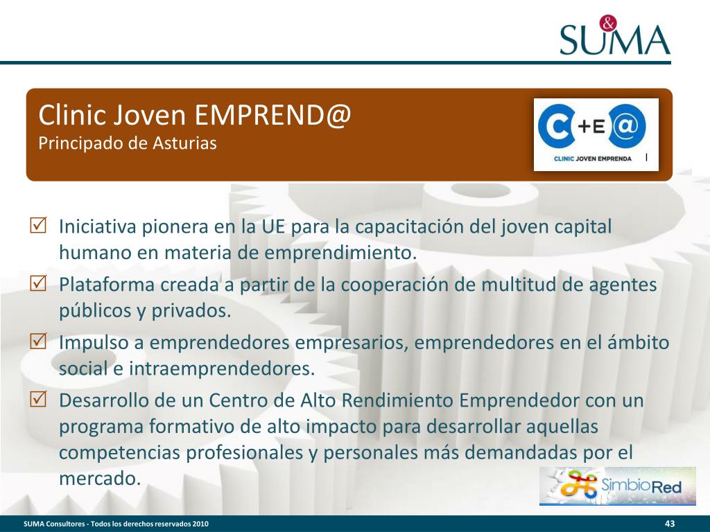 Clinic Joven EMPREND@ • Principado de Asturias • Iniciativa pionera en la UE para la capacitación del joven capital humano en materia de emprendimiento. • Plataforma creada a partir de la cooperación de multitud de agentes públicos y privados. • Impulso a emprendedores empresarios, emprendedores en el ámbito social e intraemprendedores. • Desarrollo de un Centro de Alto Rendimiento Emprendedor con un programa formativo de alto impacto para desarrollar aquellas competencias profesionales y personales más demandadas por el mercado.
