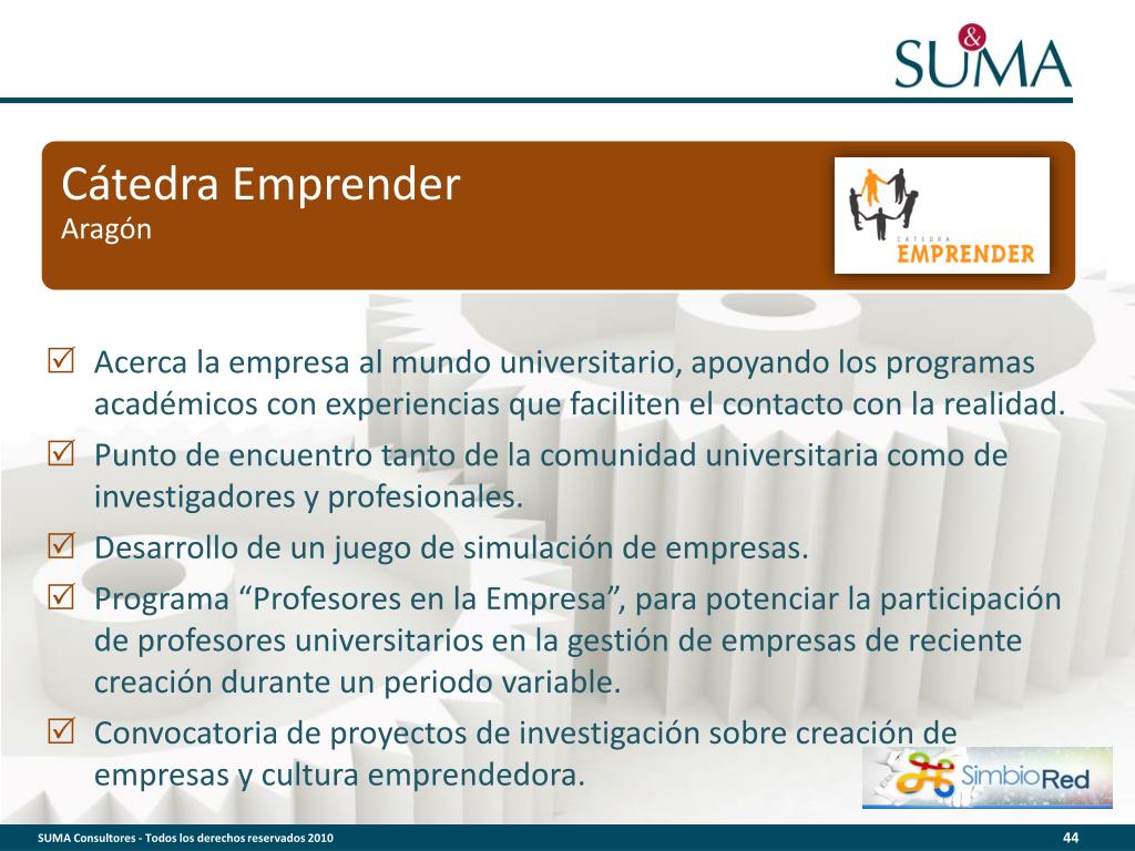 Cátedra Emprender • Aragón • Acerca la empresa al mundo universitario, apoyando los programas académicos con experiencias que faciliten el contacto con la realidad. • Punto de encuentro tanto de la comunidad universitaria como de investigadores y profesionales. • Desarrollo de un juego de simulación de empresas. • Programa “Profesores en la Empresa”, para potenciar la participación de profesores universitarios en la gestión de empresas de reciente creación durante un periodo variable. • Convocatoria de proyectos de investigación sobre creación de empresas y cultura emprendedora.
