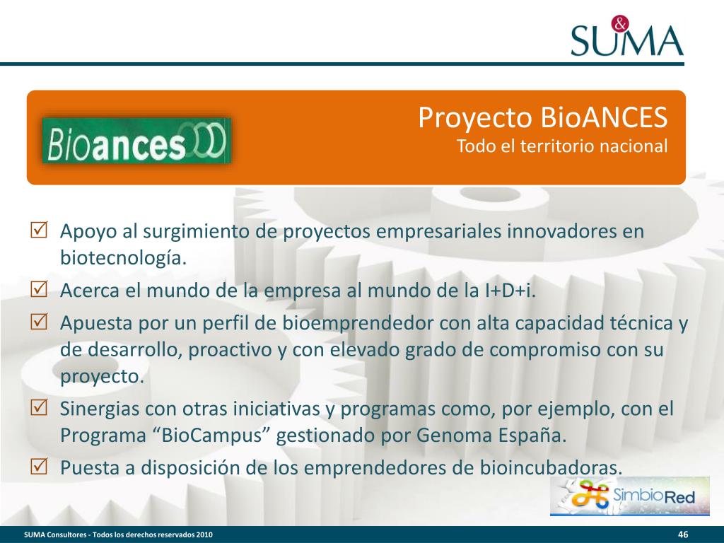Proyecto BioANCES • Todo el territorio nacional • Apoyo al surgimiento de proyectos empresariales innovadores en biotecnología. • Acerca el mundo de la empresa al mundo de la I+D+i. • Apuesta por un perfil de bioemprendedor con alta capacidad técnica y de desarrollo, proactivo y con elevado grado de compromiso con su proyecto. • Sinergias con otras iniciativas y programas como, por ejemplo, con el Programa “BioCampus” gestionado por Genoma España. • Puesta a disposición de los emprendedores de bioincubadoras.