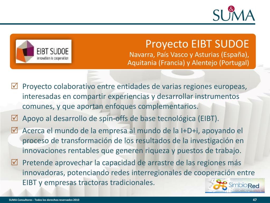 Proyecto EIBT SUDOE • Navarra, País Vasco y Asturias (España), Aquitania (Francia) y Alentejo (Portugal) • Proyecto colaborativo entre entidades de varias regiones europeas, interesadas en compartir experiencias y desarrollar instrumentos comunes, y que aportan enfoques complementarios. • Apoyo al desarrollo de spin-offs de base tecnológica (EIBT). • Acerca el mundo de la empresa al mundo de la I+D+i, apoyando el proceso de transformación de los resultados de la investigación en innovaciones rentables que generen riqueza y puestos de trabajo. • Pretende aprovechar la capacidad de arrastre de las regiones más innovadoras, potenciando redes interregionales de cooperación entre EIBT y empresas tractoras tradicionales.