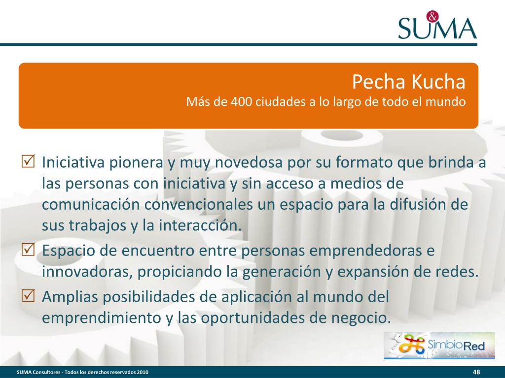 Pecha Kucha • Más de 400 ciudades a lo largo de todo el mundo • Iniciativa pionera y muy novedosa por su formato que brinda a las personas con iniciativa y sin acceso a medios de comunicación convencionales un espacio para la difusión de sus trabajos y la interacción. • Espacio de encuentro entre personas emprendedoras e innovadoras, propiciando la generación y expansión de redes. • Amplias posibilidades de aplicación al mundo del emprendimiento y las oportunidades de negocio.