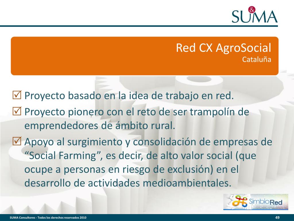 Red CX AgroSocial • Cataluña • Proyecto basado en la idea de trabajo en red. • Proyecto pionero con el reto de ser trampolín de emprendedores de ámbito rural. • Apoyo al surgimiento y consolidación de empresas de “Social Farming”, es decir, de alto valor social (que ocupe a personas en riesgo de exclusión) en el desarrollo de actividades medioambientales.